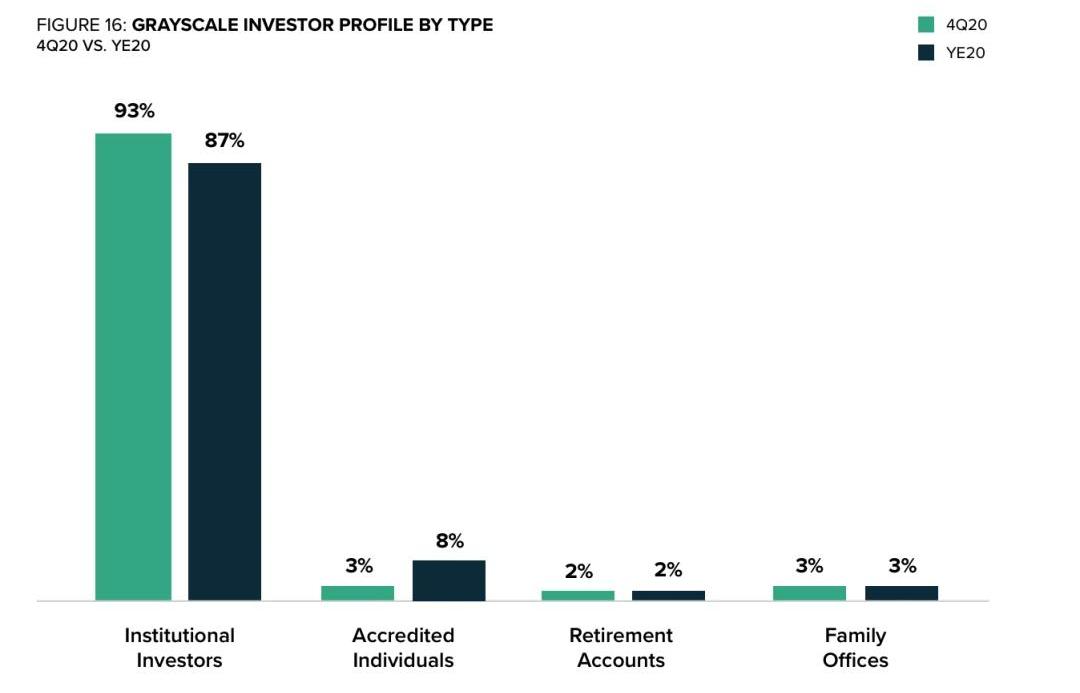 正如我們在之前的報告中指出的那樣,流入灰度比特幣信托的資金占挖礦比特幣的比例持續增長。這一指標意義重大,因為礦工是眾所周知的市場的自然賣家,他們經常用新挖的比特幣來支付運營費用。在2020年第四季度,比特幣流入量約為挖出比特幣的194%。然而,這些比較只是為了說明市場的供求關系。它們并不能用來說明在報告期內新挖出比特幣的去處。機構投資者加入其中