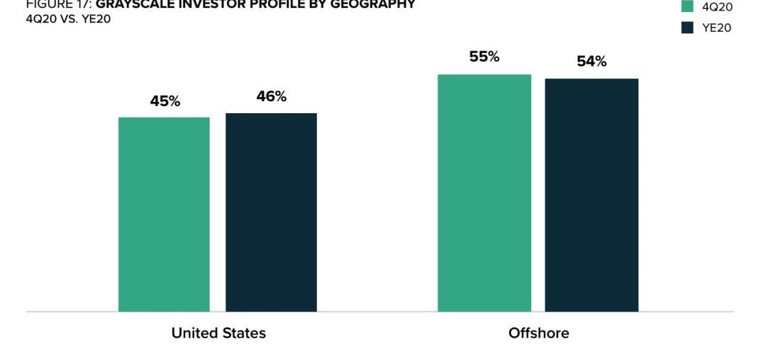 本季度灰度產品新增投資資金的地域來源中,境外投資者的比重略有增加(55%),與2020年的年度情況一致。