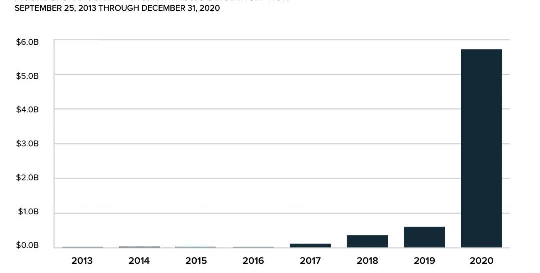 2020年,灰度系列產品總共籌集了超過57億美元的資金,是該公司從2013年成立到2019年底累計流入的12億美元的4倍多。雖然該公司在2020年開始時管理的資產為20億美元,但截至2021年1月13日,該公司目前持有的資產超過247億美元,成為有史以來增長最快的資產管理公司之一。2020年第四季度,機構投資者參與了灰度產品的投資,93%的資金流入來自這部分投資者。比特幣信托、以太坊信托領先