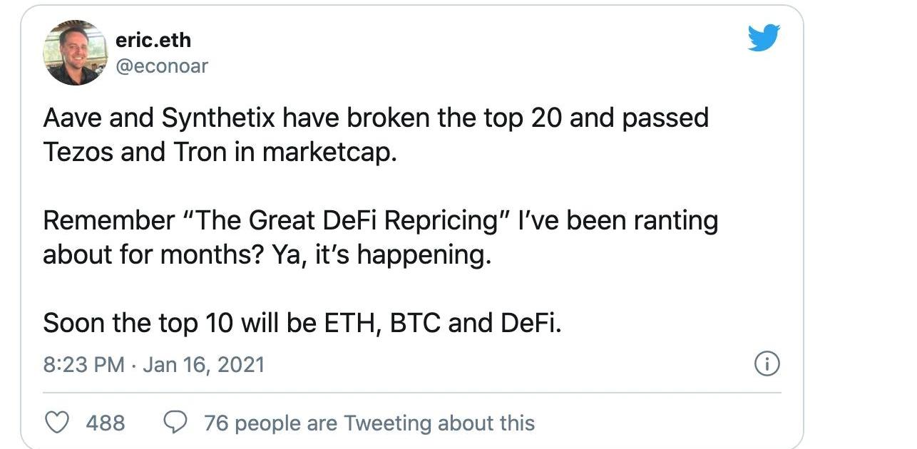 Aave和Synthetix的市值已經突破了前20名,超過了Tezos和Tron。還記得我嘮叨了幾個月的“DeF偉大的重新定價”嗎?是的,它正在發生。很快,前十名將是ETH、BTC和DeFi。——eric.eth2021年1月16日如果說過去一周有什么跡象的話,那就是整體市場似乎終于意識到了這種不協調。SNX和AAVE在本周分別上漲了40%和74%,市值均超過23億美元,超過了Tezos和Tron。
