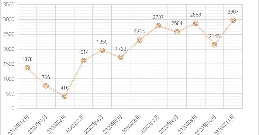 來源:01區塊鏈、零壹智庫從更長時間維度來看,從2009年前后的748家到如今的64062家,中國的區塊鏈相關企業注冊數量已經增長85倍以上。中國區塊鏈相關企業發展的第一個明顯“加速點”出現在2017年前后。當前市場上接近90%的相關企業都成立于2017年之后。若將時間維度進一步細化,回顧2017-2020年前11個月的單月新增區塊鏈相關企業數量,不難發現:在過去的四年間,中國區塊鏈相關企業的發展歷程可以大致分為三個階段:擴張期、低谷期和回升期。其中,從2017年到2018年6月是中國區塊鏈相關企業引來的首個急速擴張期,單月新增企業數量從百余家上漲至2000余家,區塊鏈相關企業總量在這段時間翻了3倍。這段時間區塊鏈相關企業數量的激增主要得益于以太坊催生的數字貨幣市場火熱行情,以及摩根大通、微軟、英特爾、螞蟻、騰訊、京東等商業機構對區塊鏈技術的重視程度。2018年6月出現首個單月新增區塊鏈相關企業數量峰值后,2018年下半年,尤其是2019年以來,區塊鏈相關企業總量增速及新增數量開始出現顯著下滑。由于應用場景受限、加密貨幣行情慘淡、監管趨嚴等因素,彼時國內區塊鏈產業正在陷入“發展低谷”,各地對新增區塊鏈企業的管控也逐步收緊。不過,2019年習近平總書記“1024講話”為中國區塊鏈產業勾勒了發展藍圖,加上區塊鏈技術被納入新基建范疇,以及各部委、省市自治區相繼出臺的多項區塊鏈發展規劃,區塊鏈產業在國內迎來了諸多利好。從2020年的區塊鏈相關企業數據來看,區塊鏈企業正在進入新一輪的快速增長期。其中,2020年1-2月出現了新增企業數量暴跌的情況。這一方面是由于每年年初都是企業注冊的淡季,另一方面2020年新冠疫情的沖擊可能加劇了這一現象。圖2:單月新增區塊鏈相關企業數量趨勢圖