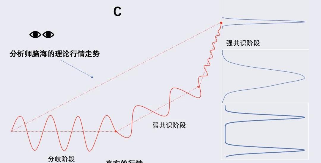 以上是一個觀點由分歧走向強共識的過程,可以稱之為共識收斂。行情發展的過程就是一個個分歧走向共識收斂的過程。收斂的過程可以是緩慢的,也可以是極速的。可以收斂于業績利好,也可以收斂于集體認知同步。分歧時交易中的常態,有分歧才有交易。分歧會在各種不同的地方落實:可以是單純的價格高低可以是下一季度報表的業績分歧可以是核心驅動變量是什么的分歧可以是估值模型的分歧可以是公司未來終局的分歧可以是行業格局的分歧可以是市場風格切換的分歧等等……分歧千千萬,對于每一個分歧點,其實都可以不斷嵌套上述的過程。所以市場每天才有這么多交易發生,價格走勢也千變萬化。交易員眼里的價格走勢,除了看到金融分析家眼里的直線,還考慮了市場群體中共識分布的演變。這背后是交易者了解市場參與者的主要構成、他們的共識是什么以及共識變化的規律等因素。意識到市場的共識從分歧走向弱共識再走向強共識的共識收斂過程,也能賺錢,而且能賺大錢和賺快錢。