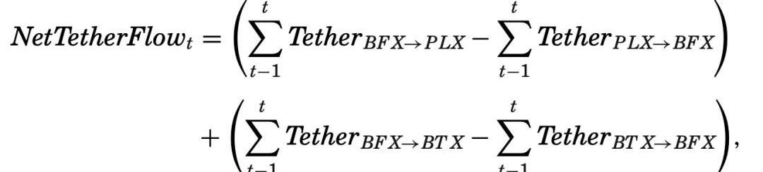 Tetheri→j是在t-1到t時刻,從交易所i轉移到交易所j的代幣數量。兩個區塊鏈上的代幣流量大小非常匹配,而且兩個流量之間的相關性很高,但是考慮到將硬幣移動到交易所和清算區塊鏈上交易的不同延遲,時間并不完全匹配。考慮到區塊鏈交易的時間是實際資本流動的代理,為了減少我們對Bitfinex的Tether凈流量和比特幣的凈回流的測量干擾,我們對比特幣和Tether區塊鏈上的兩個流量進行平均: