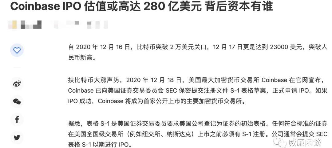 希望我們別再落后下去了。5、更多加密企業上市2021年可以預見的一件事是Coinbase即將上市,并且因為幾乎沒啥要募資的,所以估計應該上市沒太大阻力,畢竟Coinbase從頭到尾的主旋律就是倆字:合規。而且據各方消息和市場反應來看,Coinbase這輪上市之后市值極有可能沖到數百億美金的市值。