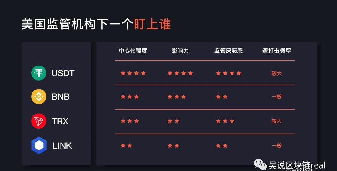 SEC評判的核心標準是該項目是否屬于證券。測試標準為經典的Howey測試,包括投資人需要投入資金或其他資源;投資人的資金、服務或物品在投資發起人的控制下集中統一投入共同的項目;投資人期待投資項目帶來盈利回報,同時投資人也需要承擔資本損失的風險;投資人的回報僅由投資發起人或與投資人無關的第三方賺取;一般來說,投資人不參與項目的實質經營,項目的成功與否與投資人無關。其中最關鍵的是投資人期待投資項目帶來盈利回報。參考《美國非主權數字貨幣的法律監管路徑》但以這個標準來看,SEC幾乎可以打擊絕大多數的加密貨幣項目,那么它選取項目打擊的核心標準是什么?從過去經驗來看有以下四點:1、中心化程度越高,越容易遭到打擊;例如XRP。2、項目影響力、知名度越大,越容易遭到打擊;例如Libra。3、募資額度越高,越容易遭到打擊;例如歷史第一的EOS和TELEGRAM。4、對待監管態度越抗拒,越容易遭到打擊;例如BitMEX。目前眾多懷疑聲音中最核心的四個幣種分別是:USDT、TRX、BNB、LINK。中心化程度里,USDT最高,其次為BNB、TRX、LINK;項目影響力而言,USDT最高,其次為BNB、TRX、LINK;募資額度方面,BNB在2017年募集了1500萬美金;LINK在2017年募集了3200萬美金;波場募集約4000個比特幣,因為時間都比較早、募資額度不高,所以可以一定程度忽略。