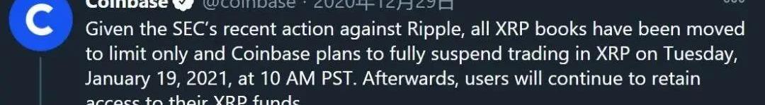 XRP/HKD-1.54%編者按:本文來自白話區塊鏈,作者:一棵楊樹,Odaily星球日報經授權轉載。12月29日,市場上傳聞已久的消息終于塵埃落定,Coinbase官宣將于2021年1月20日起暫停XRP交易。