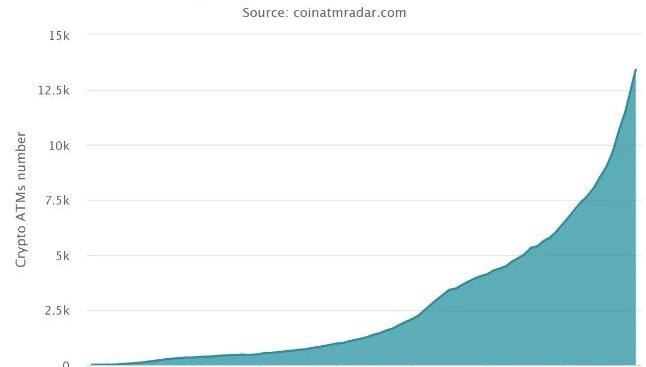 這個值要比實際上的交易量低9倍,它剔除了交易所人為地夸大以及“刷量”造成的不可靠數據。2020年,可用的比特幣ATM機數量也大幅增加,且以有史以來最快的速度增長。根據coinATMradar的數據顯示,目前全球至少有13400臺比特幣ATM,高于一年前的6039臺和五年前的460臺。