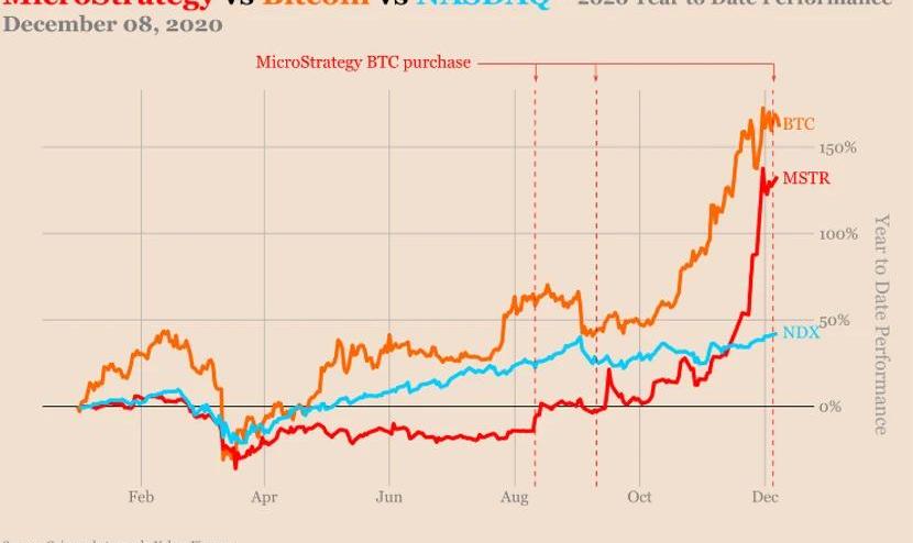 XRP/HKD-0.66%碳鏈價值原創團隊編譯8月11日,MicroStrategy宣布已在比特幣上投資了2.5億美元,從此吹起了機構投資者進軍比特幣市場的號角;9月8日,MicroStrategy再宣布投入1.75億美元購買比特幣,至此該公司在比特幣上的投資規模已經達到4.25億美元;12月21日,MicroStrategy又宣布6.5億美元現金購買約29,646枚比特幣。許多人對此產生質疑,這家在納斯達克上市的商業智能軟件行業巨頭為什么在最近這段時間內一而再、再而三地購買比特幣,一開始大家覺得MicroStrategy購買比特幣可能是為了給公司帶來增量收益,但如果你關注一下該公司在股市上的表現就會發現,MicroStrategy購買比特幣是多么“劃算”的一筆交易!MicroStrategy在比特幣上投入的資金越來越多