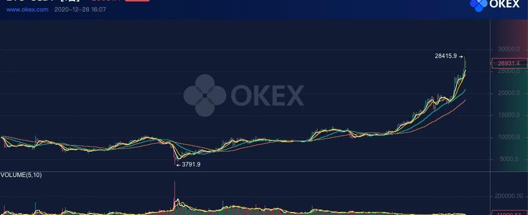 11月5日,BTC突破15000美元,刷新2019年6月以來最高記錄;11月25日,BTC首次沖擊歷史高點但以失敗告終,此后一直在18000~19000美元附近盤整近20天;12月16日,BTC再次沖擊歷史前高,成功站上2萬美元大關,刷新歷史記錄。由于2017年在創下歷史高點后,BTC在其后一周暴跌超過30%。因此,此番不少投資者預估BTC將開始回調,選擇加倉做空。但這次,BTC卻沒有重演歷史,漲勢絲毫不減:22000、24000、26000、28000……一個個關口接連被攻下,最終達到28415USDT,創下新的歷史記錄。OKEx行情顯示,從年初至今,BTC累計漲幅達到275%;從「312」的3800美元算起,BTC最高漲幅接近650%。并且,按照目前的走勢,本月BTC將繼續錄得正增長,屆時將創下自2019年以來最長月度連漲周期——連續三月上漲。BTC的上漲,也帶動ETH隨之增長,ETH價格不斷刷新歷史記錄,創下自2018年5月21日以來新高。過去兩個月,ETH價格從380美元最高上漲至740美元,漲幅達接近1倍;從年初至今,ETH今年累計漲幅達到450%。