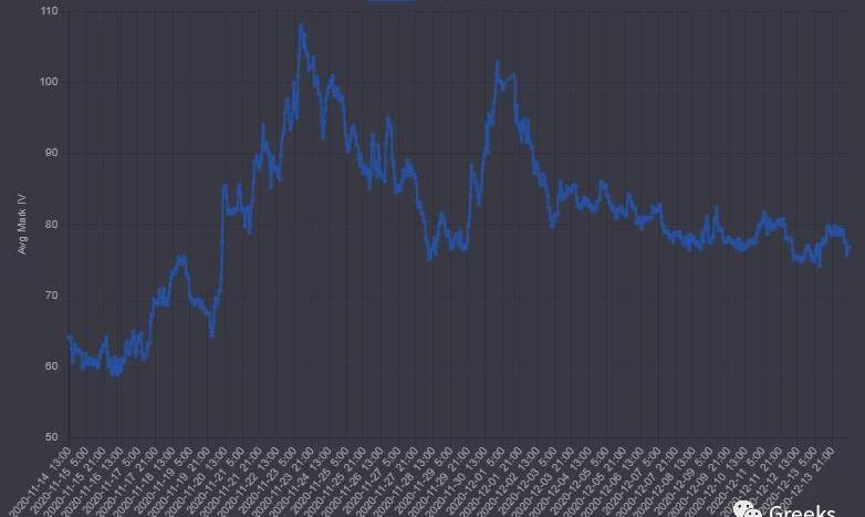 BTC歷史波動率10d49%30d65%90d52%1Y79%期權成交量4.43億美元,持倉量穩定,目前為39億美元,市場相對平靜。各標準化期限隱含波動率:今日:1m62.8%,3m69.5%,6m75.4%12/13:1m59.1%,3m67.2%,6m73.5%各期限的IV因為價格拉升而上漲,目前市場規律比較明顯,IV會在橫盤期間下降,反彈期間企穩,明顯上漲時反彈,略滯后于價格移動。
