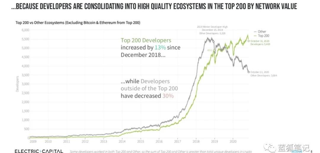 高質量的生態系統,例如以太坊生態的開發者持續增長,而一些生態的開發者開始下降,在市值前200之外的生態中,開發者數量從2018年12月以來下降了30%。