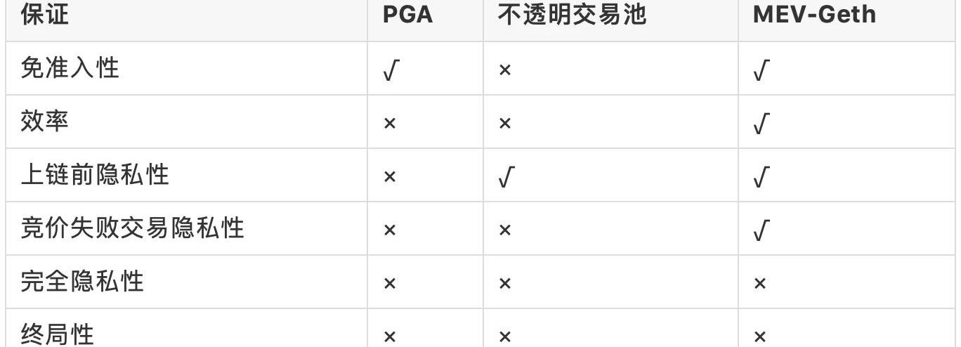 我們認為,如果不采用中立、公開、開源的基礎設施是實現免準入的MEV抽取,MEV就有可能成為一個內部人的過家家。作為一個組織,我們承諾會公平、道德、中立的MEV抽取方法提供參考實現。我們也希望能通過這樣做來防止以太坊被基于信任的暗池或者專門的通道侵蝕,這些都是安全上的薄弱點。我們推出MEV-Geth有雙重目標,一方面希望為MEV的抽取創建一個能保護以太坊特性的生態系統,另一方面,系統能圍繞我們的研究和開發路線圖,與社區展開對話。設計目標