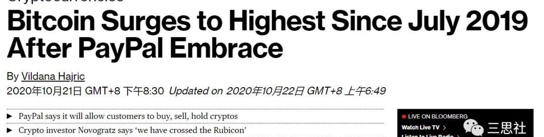 10月21日,全球數字支付平臺PayPal宣布將允許用戶通過其在線錢包購買、銷售和持有比特幣等數字貨幣,這一消息刺激比特幣大漲8%。