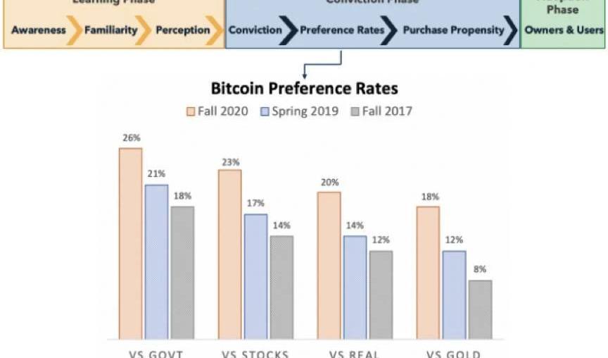 這項調查旨在評估一般人群對比特幣的認識、熟悉、感知、信念、相對偏好、以及購買傾向,我們可以在這項調查項目中深入了解加密貨幣普及應用情況。下圖展示了一個「加密貨幣采用進度」: