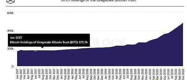 灰度是目前全球最大的加密資產管理公司之一,由于最近比特幣價格不斷飆升并接近于2017年歷史最高點,灰度旗下資產管理規模超過100億美元,上圖展示了灰度比特幣信托基金的比特幣持有量。灰度旗下加密貨幣基金與傳統交易所交易基金具有一定相似性,因此用戶可以通過CharlesSchwab等零售經紀服務提供商進行直接購買,所以廣受市場歡迎。但問題是,在灰度購買加密貨幣信托基金需要以高溢價進行交易,這也導致散戶投資者不得不以比基礎加密資產的價格高得多的溢價購買灰度加密貨幣產品。GuggenheimPartners公司入場也是最近加密貨幣市場的最新信號,表明越來越多宏觀投資機構開始對比特幣感興趣。今年早些時候,投資傳奇人物保羅·都鐸·瓊斯概述了比特幣可以作為一種對沖央行政策的通貨膨脹對沖工具。今年十月,保羅·都鐸·瓊斯重申了自己對比特幣的看漲立場,聲稱自己“越來越喜歡比特幣”了;今年十一月,億萬富翁斯坦利·德魯肯米勒也表示已經“押注”比特幣。