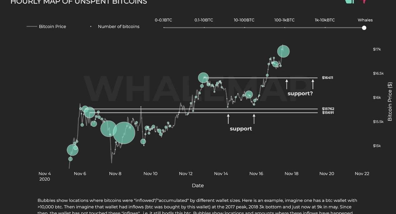 BTC/USDT每周圖表1.“巨鯨”仍在囤積比特幣“巨鯨”們是堅定的比特幣信仰者。整個11月,Cointelegraph報告顯示,隨著比特幣價格的上漲,巨鯨群正在穩步形成。當比特幣巨鯨在某個價格點購買BTC并且持有它們時,就會出現這些巨鯨群。分析師將這個信號解釋為巨鯨正在囤積比特幣并且短時間內沒有出售的意愿。持續的比特幣漲勢與之前的價格周期之間的區別在于,最近的上升趨勢已被證明更具可持續性。實際上,每個巨鯨群都表明,回收的每個主要支撐價位都伴隨著巨鯨的不斷囤積比特幣。