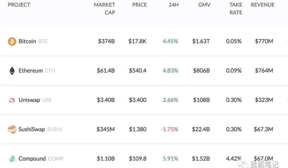 *DeFi推動下的以太坊的交易費用以太坊的交易費用在DeFi推動下,逐漸形成對其他協議和項目的碾壓之勢。目前以太坊年化捕獲費用高達7.6億美元,僅次于比特幣的7.7億美元。此外,費用靠前的協議和項目基本上都是DeFi領域的。隨著DeFi的發展,這個趨勢只會增強。而隨著EIP-1559提案的實施,這意味著ETH將有機會捕獲以太坊的費用收益。它會減少ETH的通脹率,甚至在一定臨界點帶來通縮的可能性。