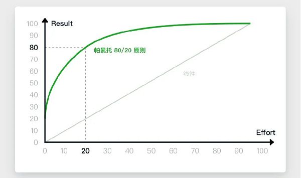 在某一過程中,80% 的影響來自于 20% 的投入,這一現象以帕累托為名,稱為「帕累托原則」,思想:更集中的投入將產出大于預期的結果