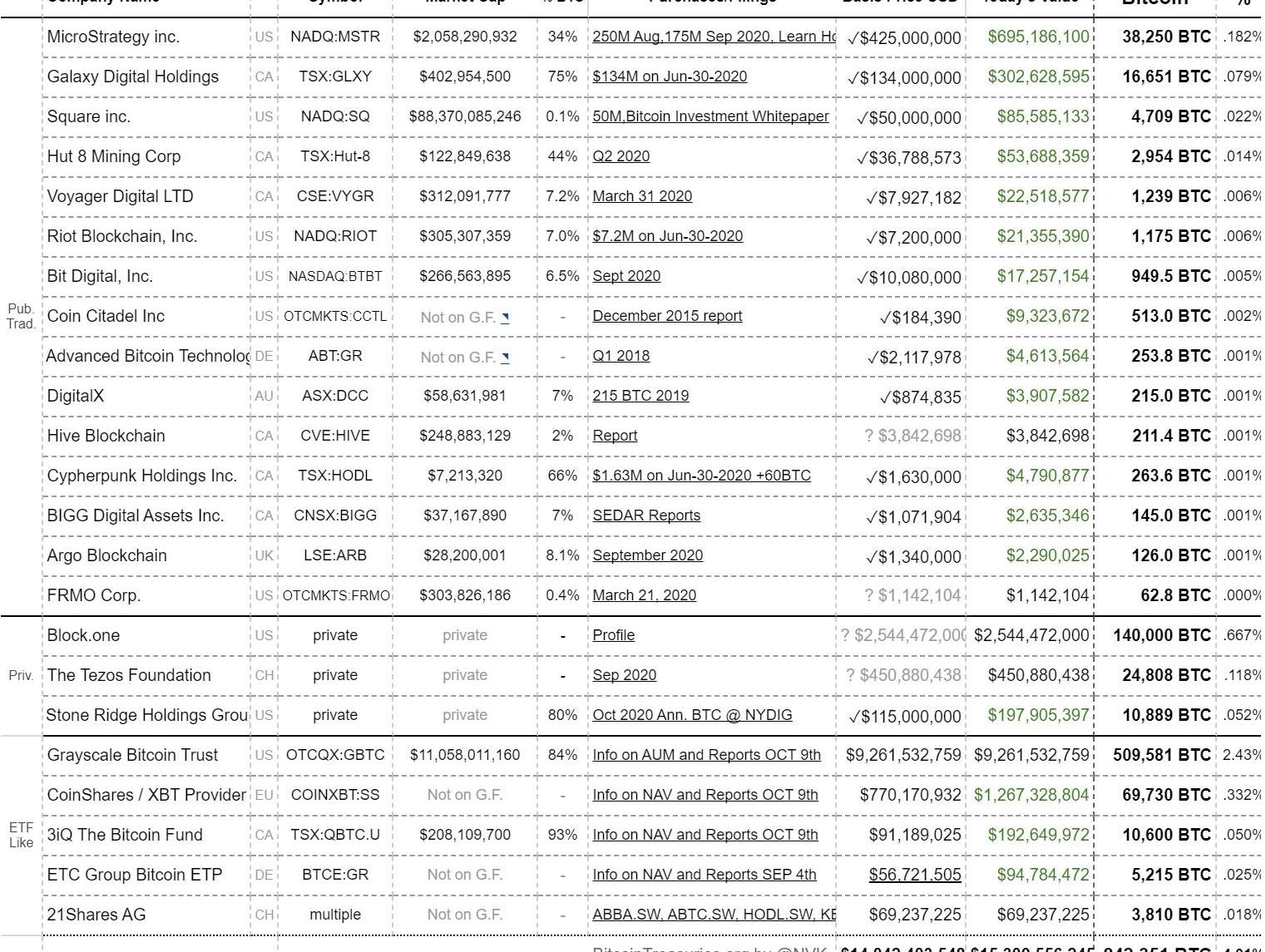 與以往不同,本輪牛市出現了大量機構的身影。經核財經APP了解,今年以來上市公司、投資機構加快了布局比特幣的步伐,影響力日益凸顯。根據BitcoinTreasuries網站統計,迄今為止,全球共有23家公開上市公司、投資機構等持有842351枚比特幣,當前價值約153億美元。其中,就有資產管理巨頭灰度、美國軟件巨頭MicroStrategy、移動支付巨頭Square和GalaxyDigital等。