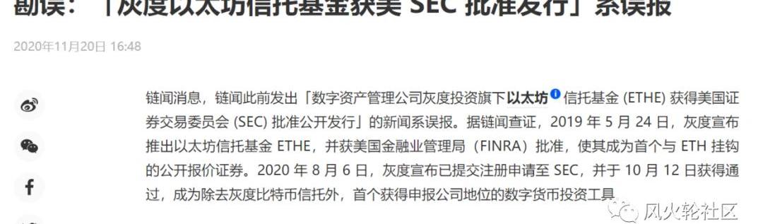 大家好,我是佩佩,今天要來聊下ETH,因為受下午國內媒體轉載的關于「灰度以太坊信托基金獲美SEC批準發行」的消息影響,震蕩了一周左右的eth終于起飛,截止昨晚7時價格升到505U,且還在一個上升趨勢中,也算是正式突破了9月份488高位,創下了年內新高。當然了,有很多小可愛第一時間就發現了這則消息屬舊聞,后面媒體也進行了勘誤: