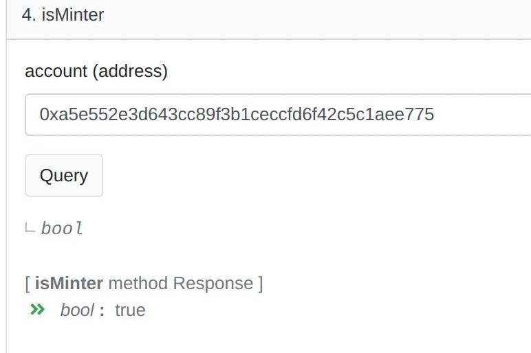 圖四:項目擁有者擁有minter權限查詢項目擁有者是否擁有minter權限的結果如圖四所示。至此,項目擁有者擁有執行mint函數的權利,最終惡意鑄造了5億個WALT代幣,致使項目投資者遭受損失。安全建議