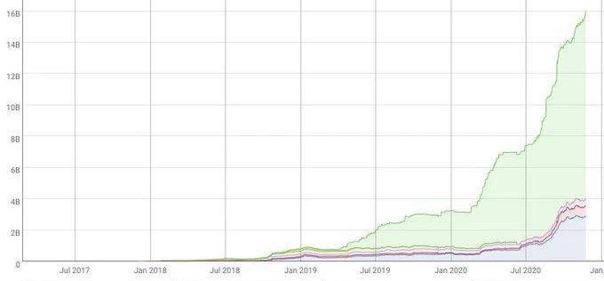 圖片來源:RichardChen盡管今年出現了許多競爭者和“殺手”,但以太坊仍然是整個生態系統的基礎。6)自2020年初以來,整個DeFi領域的總價值已激增近2000%,超過140億美元,其中5個不同的項目的鎖定資產總價值超過10億美元,這表明生態系統正在迅速成熟。
