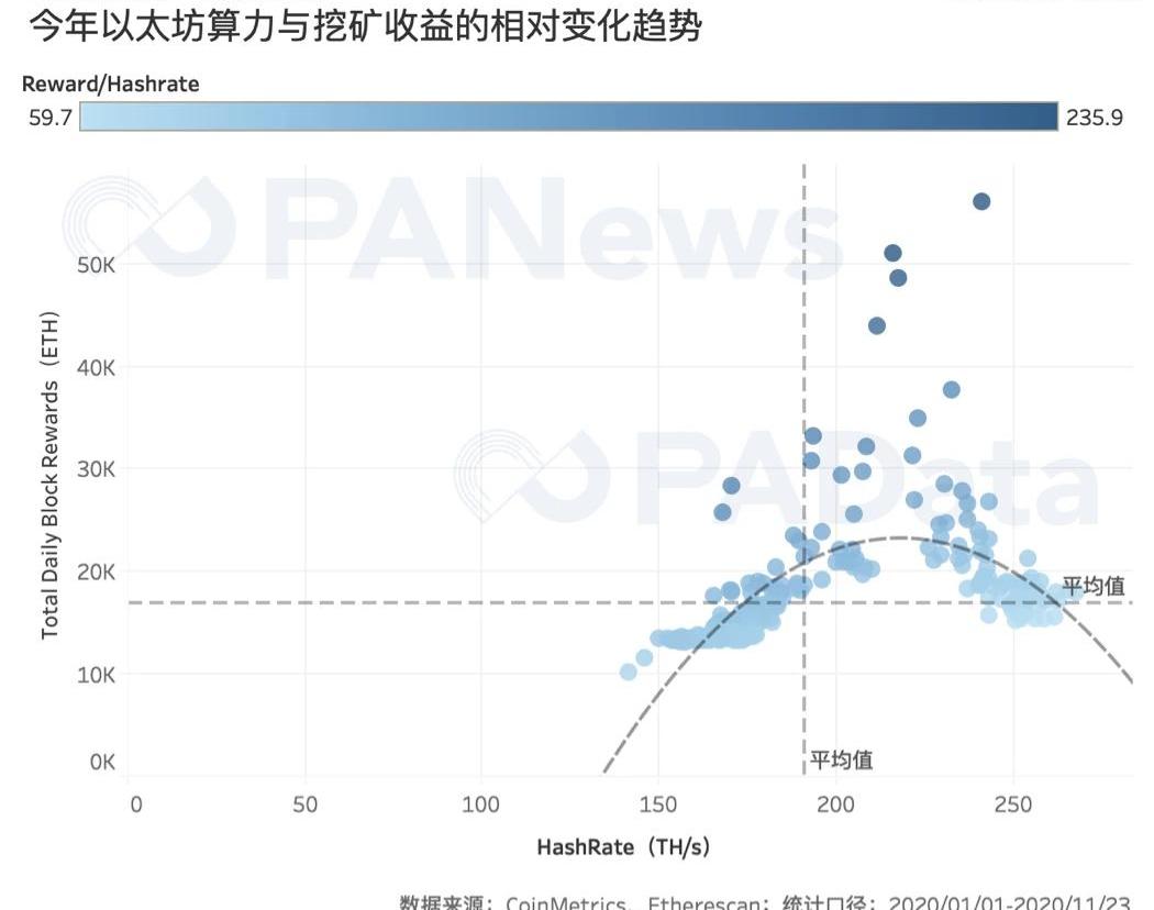 ETH2.0距離實現Phase1.5階段還需要至少一年以上的時間,也即距離信標鏈具有執行功能還有至少一年以上的時間,在這段時間內,ETH1的PoW挖礦還將持續。對于挖礦而言,持續性是有限的,未來該繼續挖礦還是參與前期質押呢?根據Etherescan和CoinMetrics的數據,今年以太坊全網算力和全網單日挖礦收入之間可以擬合為一條多項式曲線,當全網算力在215TH/s以下時,全網單日挖礦收入隨算力的增加而增長,當全網算力在215TH/s以上時,全網單日挖礦收入隨算力的增加而減少。根據統計,截至11月23日,今年全網平均單日挖礦收入約為1.69萬ETH,全網算力約為190.80TH/s,每1T算力的平均日收入約為89.16ETH。按照f2pool所列的ETH最高算力礦機芯動A10Pro來換算,相當于單臺礦機日均收入0.064ETH,年收入約23.43ETH。
