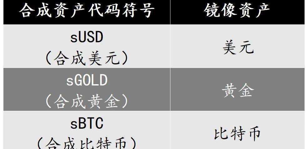 #Synthetix更新一覽:全新的合成資產交易所及獨樹一幟的治理模型Synthetix是DeFi中頭部的合成資產平臺。“合成資產(Synths)”是對目標資產鏡像模擬,價格錨定的資產,持有合成資產并不意味著持有鏡像資產而是獲得了其價格風險敞口。目前Synthetix上的合成資產包括:法幣、期貨、加密貨幣等。除此之外Synthetix還提供反向追蹤價格的合成資產,以BTC為例,當BTC的價格下降時,iBTC的價格就會上升。以下為部分合成資產的舉例:
