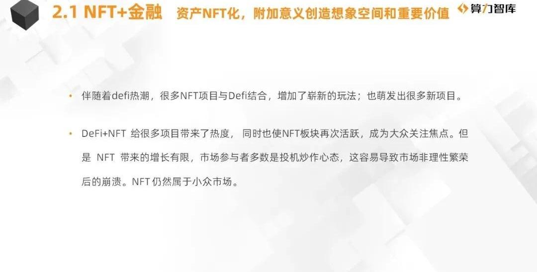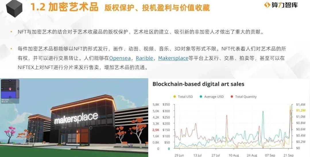 您正在閱讀算力智庫第4篇微研報系列前言2020年,NFT市場快速增長,9月NFT市場交易量成功突破700萬美元,月內激增十倍以上;10月交易量突破800萬美元,漲勢未停;截止2020年10月17日,NFT市場交易總量已超過$1.36億,賣出NFT達500萬個,均價約為27.3美元,整體交易數據近月來呈明顯增長趨勢。接力DeFi熱潮,NFT或將成為下一個風口。2020年即將結束,但NFT的熱度卻只增不減。從游戲資產、加密藝術品到與多方實體行業合作,NFT在不斷尋找更廣闊的市場空間。作為非同質化代幣,NFT具有獨一無二、稀缺、不可分割的屬性。并將虛擬與現實相鏈接,通過合規性改進,可以實現知識產權、房地產等具象化表征。算力智庫從行業案例分析出發,梳理研究了NFT與多元行業合作的價值。盡管NFT吸引了市場大部分的目光,但在交易、技術、用戶量等方面還存在或多或少的問題。未來NFT板塊能否持續保持熱度,挖掘市場爆火的潛力,將更值得期待。