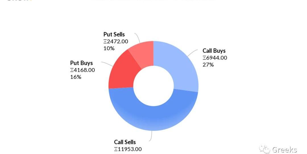 以太坊的期限結構兩頭又開始下降,以太坊短期IV快速下降,畢竟灰度對以太坊的購買力度是明顯不及比特幣的。賣出看漲期權今天是絕對強勢的一方,11953幣占比47%,看跌期權總占比僅25%。