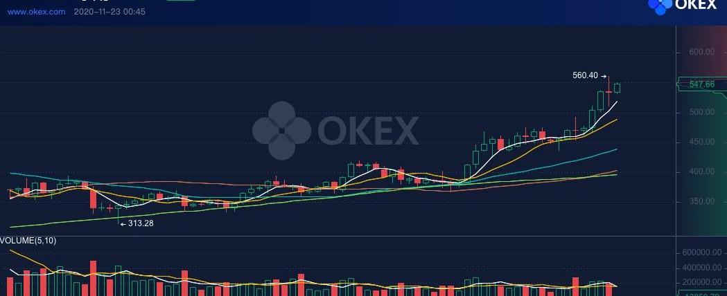 1.現貨市場OKEx行情數據顯示,上周ETH價格一度上漲至560USDT,周內收于532.81美元,環比上漲17.9%。
