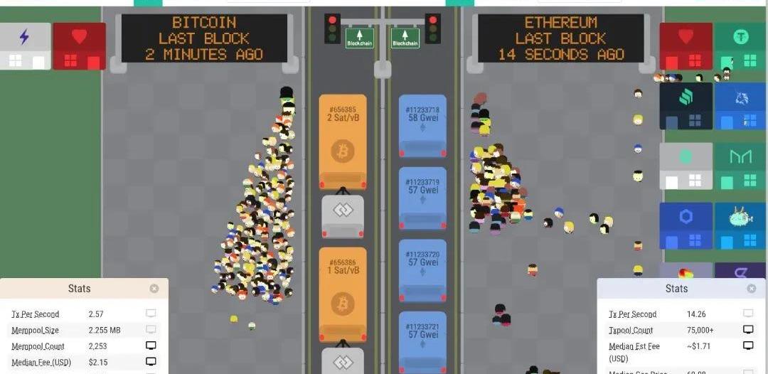 待確認交易數量是指已經發起等待礦工打包進新區塊的交易,待確認交易是反應鏈上活躍度和擁堵情況的一個指標。礦礦介紹這個主要是有一個工具做的很有趣,能很直觀的看到BTC、ETH、BCH鏈上交易情況,包含目前待確認的交易數、區塊高度、中位數手續費等,而且將鏈上實際交易模擬成人上公共交通的動畫效果,強烈推薦打開網站感受一下。