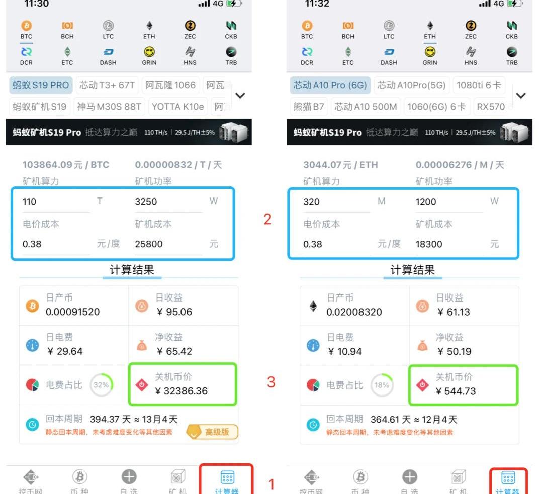 關機幣價也是礦工非常關注的一個指標,關機幣價代表了礦機的安全邊際。這個指標可以通過挖幣網手機APP查詢。打開挖幣網APP,點擊右下角「計算器」,在最上面選擇挖礦幣種,藍色框中輸入礦機算力、功率數據以及電價,就能計算出關機幣價。下圖左邊計算的是S19PRO的關機幣價;右邊計算的藍寶石5600XT8卡機的關機幣。