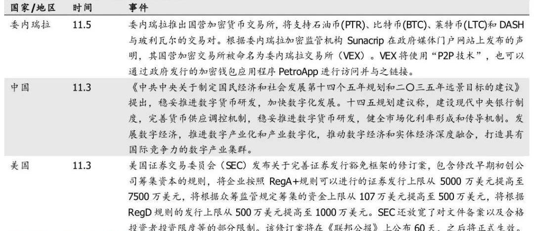 委內瑞拉:委內瑞拉推出國營加密交易所VEX。委內瑞拉推出國營加密貨幣交易所,將支持石油幣(PTR)、比特幣(BTC)、萊特幣(LTC)和DASH與玻利瓦爾的交易對。根據委內瑞拉加密監管機構Sunacrip在政府媒體門戶網站上發布的聲明,其國營加密交易所被命名為委內瑞拉交易所。VEX將使用“P2P技術”,也可以通過政府發行的加密錢包應用程序PetroApp進行訪問并與之鏈接。中國:十四五規劃提出穩妥推進數字貨幣研發。《中共中央關于制定國民經濟和社會發展第十四個五年規劃和二〇三五年遠景目標的建議》提出,穩妥推進數字貨幣研發,加快數字化發展。十四五規劃建議稱,建設現代中央銀行制度,完善貨幣供應調控機制,穩妥推進數字貨幣研發,健全市場化利率形成和傳導機制。發展數字經濟,推進數字產業化和產業數字化,推動數字經濟和實體經濟深度融合,打造具有國際競爭力的數字產業集群。美國:美國SEC發布關于證券發行豁免框架的修訂案,提高初創公司資金籌集上限。美國證券交易委員會發布關于完善證券發行豁免框架的修訂案,包含修改早期初創公司籌集資本的規則,將企業按照RegA+規則可以進行的證券發行上限從5000萬美元提高至7500萬美元,將根據眾籌監管規定籌集的資金上限從107萬美元提高至500萬美元,將根據RegD規則的發行上限從500萬美元提高至1000萬美元。SEC還放寬了對文件備案以及合格投資者投資限度等的部分限制。該修訂案將在《聯邦公報》上公布60天,之后將正式生效。
