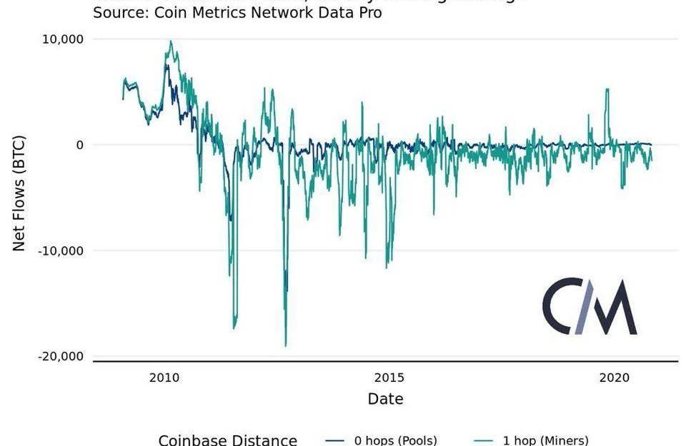 要計算礦工資金流,我們首先匯總所有從coinbase交易中收到付款的地址,并將其標記為首次轉賬(0-hop)地址。然后,將該組中的所有地址以及已從該組中某個地址接收了付款的地址標記為二次轉賬(1-hop)地址。由于礦池錢包的通常架構是礦池最早獲得區塊中的獎勵,然后才將其分配給礦工,因此,0-hop地址通常代表礦池,而1-hop地址通常代表礦工。由此可以看出,現有試圖從0-hop地址支出習慣推斷出礦工行為的系統在理論上是不健全的,因此無法準確衡量礦工的意圖。相反,它們衡量的是礦池經營者的活動。當然要承認,單純基于coinbase交易中的距離標記礦工和礦池是一種不完善的技術。將這一方法論應用于評估比特幣早期網絡很奏效,在早期網絡中,個人挖礦和另類礦池模式更受歡迎。由于第一家礦池SlushPool在2010年12月挖出了其第一個區塊,因此,特別是該日期之前的測量值僅供參考。此外,尚未從0-hop地址接收資金的礦工地址不會被標記出來。盡管如此,這種啟發式方法代表了對當前最新技術水平的重大改進,應該能準確地捕捉廣泛的趨勢。礦工,尤其是那些在網絡初期活躍的礦工,控制著大量的比特幣。在整個比特幣網絡的歷史記錄中,0-hop和1-hop地址所擁有的比特幣總數量總體上一直呈下降趨勢。2019年下半年和2020年上半年,這一趨勢發生了重大逆轉,礦工從谷底到高峰累積了38.3萬枚BTC。這種影響主要限于1-hop地址,而0-hop供應量大致保持不變。因此這種積累的大部分不會被以前的估算技術檢測到。