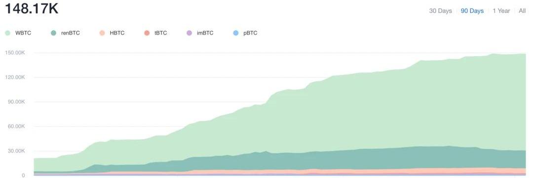 Source:WoobullCharts“Chaosisaladder”,顯然,動蕩給了比特幣增長的動力。不僅如此,主流金融機構對比特幣的青睞也日益明顯。十月,PayPal上線比特幣交易服務、新加坡星展銀行則正在籌備數字資產交易平臺。穩定性更高的比特幣在成為主流投資標的的路上越走越遠。就連DeFi步入盛夏時,比特幣也未曾停下腳步,通過WBTC、renBTC等ERC20比特幣進入熱潮,活力大增。歐科云鏈數據顯示,9月19日,以太坊上的錨定比特幣流通量突破10萬枚,目前已接近15萬枚。