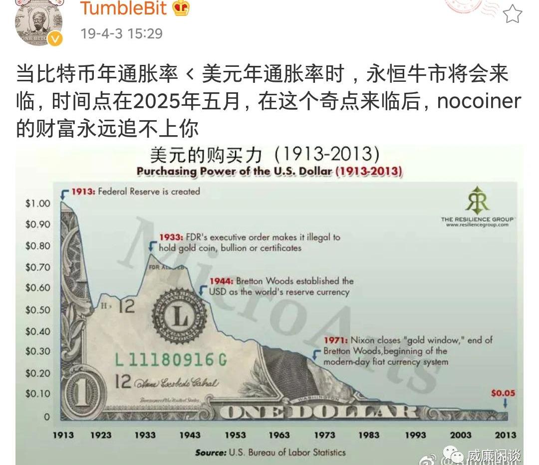 其實邏輯很簡單,美元本位來算,比特幣通脹率小于美元,就相當于比特幣對美元永遠通縮,自然就永遠漲。所謂永恒牛市。