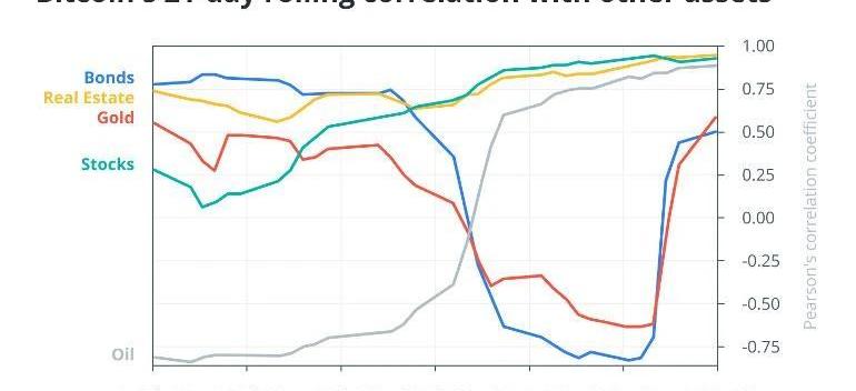 圖10,數據來源:GrayscaleInvestments根據富達投資2020年6月公布的一項調查顯示,36%的大型機構投資者擁有比特幣等數字資產;展望未來五年,91%的受訪者認為投資組合中至少應該有0.5%的投資敞口分配給數字資產。當越來越多的高凈值個人和機構投資者涌向比特幣分配風險敞口,傳統市場和比特幣投資者之間的防火墻被打破。這意味著現在很多在加密資產市場交易的人,也同時在其他市場交易。這種發展是否會導致比特幣跟其他資產的關聯性變強?確實,2019年以來,我們似乎越來越多的感受到了比特幣跟傳統資產的相關性。由于美中貿易緊張局勢、伊朗矛盾升級以及市場對COVID-19的擔憂,比特幣和黃金之間相關性似乎在增加。當前比特幣與黃金之間的相關性處于歷史高位,這表明比特幣可能比以往發揮了更多地避險功能。