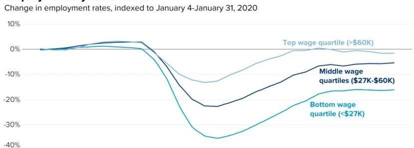圖22,數據來源:fred.stlouisfed.org抵押貸款利率創紀錄的低水平和被壓抑的需求推動了房地產銷售,房屋部門也經歷了類似的V形反彈,第二季度美國房地產總市值環比增加了約4,580億美元。但是,需要注意的是,45%的美國人沒有股票,而約有33%的美國人沒有房屋。V形復蘇是屬于最富有的美國人的復蘇,而那些沒有大量資產或收入的人還在繼續掙扎。高薪工人的就業已經基本恢復到COVID之前的水平,但是低薪工人的就業仍然很困難。因此,這是一次「K型」復蘇。