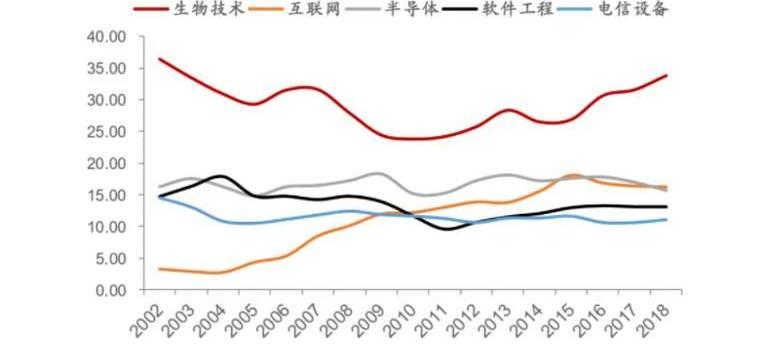 圖3,數據來源:fred.stlouisfed.org截止時間2020年9月28日標普500ShillerPE指標和Wilshire5000/GDP說明股市估值不斷抬高,處于歷史高位水平。與此同時,過去十年,美國工業生產指數及制造業產出指數的增長率分別是18.9%和16.1%。而根據中泰證券研究所的研究,「以研發支出占營收比重衡量的科技投入水平,除了生物技術研發支出占比保持增長外,包括互聯網、半導體、軟件及消費電子等在內的行業研發支出占比均沒有明顯的提升,甚至略微下降。這也表明美股這十年的牛市并非基于制造業或科技等內生增長驅動,而是基于估值推升「。