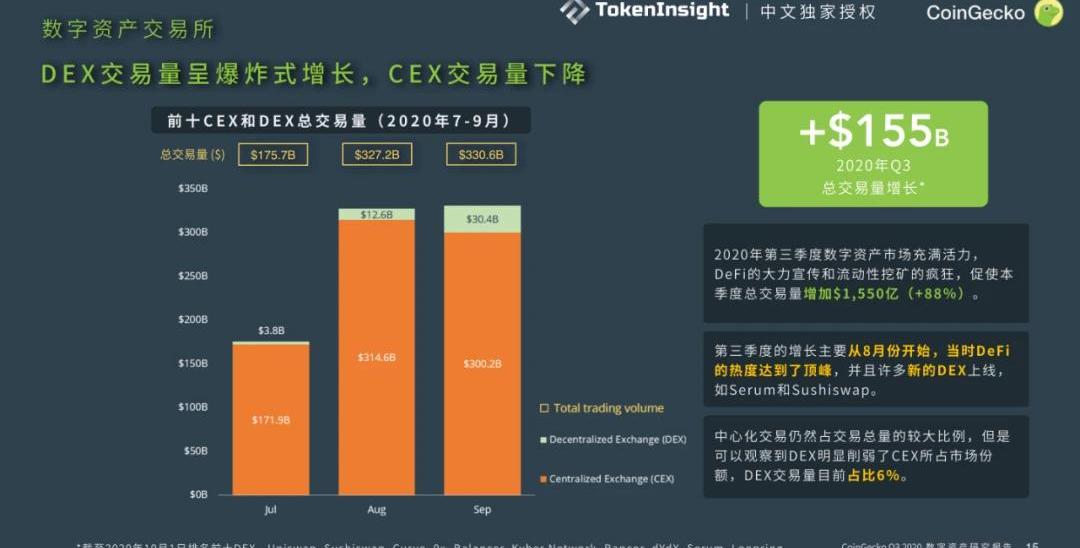 XRP/HKD-3.5%要點總結TokenInsight作為CoinGecko全球戰略合作伙伴,中文獨家發布CoinGecko2020Q3數字資產行業季度報告。2020年第三季度,去中心化金融大放異彩。DeFi項目在7月和8月繼續保持強勁增長,盡管9月份終于有所改觀。去中心化交易所的交易量強勁增長,前十大DEX在9月份實現了300億美元的交易量。在第三季度,排名前10位的DEX的交易量平均每月增長197%。與之相比,中心化交易所的數據則僅為35%。第三季度還見證了Sushiswap的上線,并目睹了第一次“吸血”式的流動性挖礦“進攻”。Sushiswap引入了其治理通證SUSHI,并從Uniswap搶走了流動性。在此期間,我們看到Uniswap的流動性下降,這可能也是Uniswap團隊加快了其UNI治理Token發行計劃的原因。
