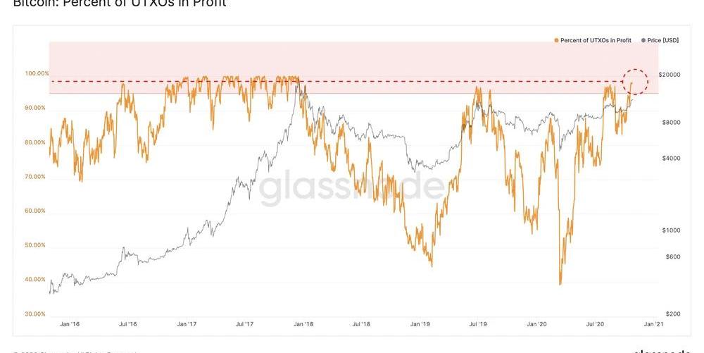 隨著比特幣最近漲到13000多美元,UTXO的盈利部分目前達到98%,這是自2017年12月以來從未達到過的數值。這種高價值,通常在BTC牛市運行期間出現,這意味著幾乎所有的UTXO都是在價格比目前低的時候創造的。