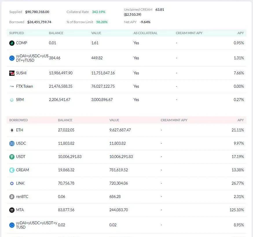 作為平臺幣,FTT流動性較差。Coinmarketcap的交易數據顯示,大部分FTT交易對單日交易額不足100萬美元,過去24小時內,FTT全網交易總額不足500萬美元。FTT在Cream上的抵押率為20%,即抵押價值7830萬美元的FTT到平臺,可以套現價值1566萬美元的其它加密貨幣,這個數量,是FTT在中心化交易所日交易總額的3倍有余!想象一下,如果SBF在市場上拋售1566萬美元的FTT,幾乎可以將幣價砸穿到歸零,但是利用Cream,他可以借入估值較高且交易深度較差的DeFi幣,同時換取大量低成本的ETH和USDT,通過出售借來的DeFi幣,并在市場恐慌下跌時用USDT或ETH抄底獲利。這種手法,相當于變相套現FTT,以一招空手套白狼來榨干市場。