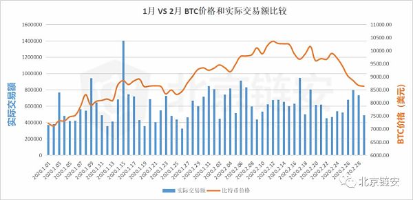 從近兩個月比特幣價格與交易額的對比來看,2020年2月上半月價格上升期間,鏈上交易額整體還是處于相對高位,但是在價格震蕩階段鏈上交易明顯降低,接著便出現了價格的大幅下跌。