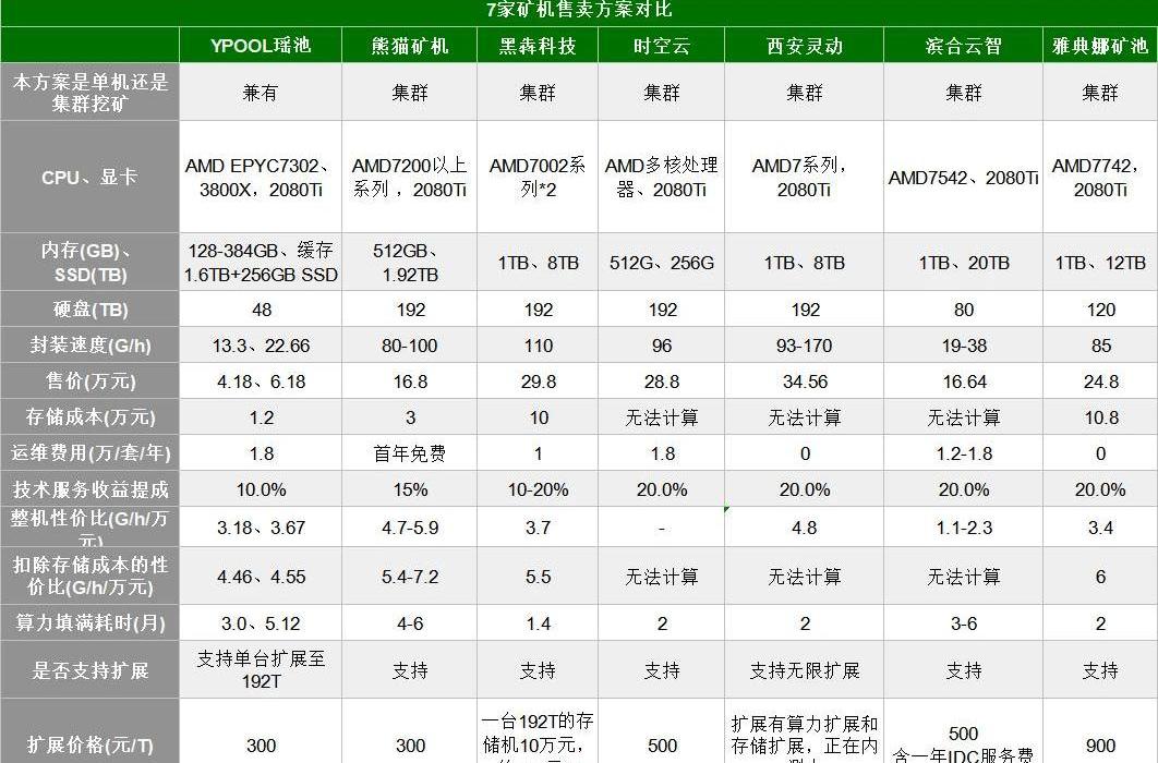 為方便對照,這張表再貼一次從整機性價比看,7大礦商中最低的不超過3GB/h/萬元,最高的可達6GB/h/萬元,其余廠商多在3.5-5GB/h/萬元。再來看扣除存儲成本的性價比,其中,時空云、西安靈動、濱合云智三家因為無法單獨計算出存儲成本而無法提供數據。“不能只算硬盤,硬盤或者存儲機的成本占比相對比較小“,時空云科技COO胡鋒表示,“要算也是算整個集群的成本,我們集群單T成本差不多1000/T。”當然,每家廠商技術方案和成本核算方式不一樣,剩余4家礦商核算出了存儲成本和扣除存儲成本的性價比。先看存儲成本,數據基本兩極分化,YPOOL瑤池和熊貓礦機的存儲成本在1-3萬元左右,而黑犇科技和雅典娜礦池的存儲成本有10萬元之巨。對此,雅典娜礦池工作人員向Odaily星球日報表示,“我們提供給用戶的是經過冗余后的實際使用存儲,不是只提供裸盤存儲服務器,是按每T存儲900元定價,900*120=108000元。“黑犇科技也表達了類似想法。再看扣除存儲成本的性價比,參數低為4.5GB/h/萬元,其余廠商多在4.5-6GB/h/萬元之間。看到這,你可能有種心里有數的感覺。但其實,和礦機性價比息息相關的還有兩項參數,運維費用和技術服務收益提成,因為非標而沒有寫入公式中,在此提醒投資者們將其納入考量范圍。在7大廠商中,雅典娜礦池、西安靈動是將兩者打包,共收取收益的20%作為服務費,而YPOOL瑤池、黑犇科技、時空云和濱合云智則對運維收取固定費用,價格在1-1.8萬元/套/年,技術服務費收取收益的10%-20%。熊貓礦機采取首年免運維的政策,技術服務費收取收益的15%。最后看算力填滿耗時,這主要由礦機的硬盤容量和封裝速度大小決定。這一數據影響到投資者何時能獲得理論算力值以及后續擴展算力的速度。整體而言,以西安靈動為代表的4家廠商滿存耗時較短,最遲2個月,耗時較長的廠商約需3-6個月。滿存后,各廠商均支持擴展算力,此時我們需要關注廠商提供的擴展價格,它決定了繼續投資的成本。除了西安靈動尚未測算好擴展價格外,其余廠商的擴展算力定價多在300-500元/T之間,雅典娜價格相對高一些。3大廠商云算力解決方案