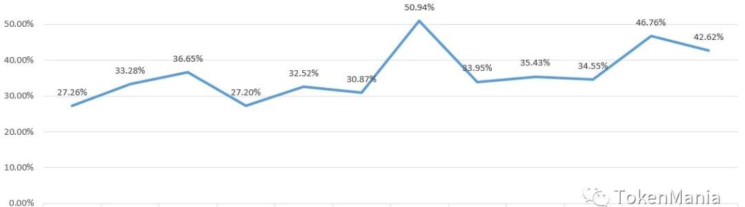 資料來源:同花順,TokenMania各類資產中數字貨幣的市值波動性最強,在泡沫膨脹與泡沫破裂的過程中,數字貨幣價格更多地呈現出暴漲暴跌的趨勢。2020年以來市場受全球疫情帶來的流動性危機影響,比特幣出現了大幅回調,近期市場波動率有所走高,但長期來看數字貨幣處于相對估值低位,隨著泡沫的擠出,數字貨幣值得作為另類資產進行部分配置。9.總結大盤走勢:本周大盤放量上行創下近期新高,大中小市值幣種全面上漲,投資者貪婪情緒上行。周初大盤延續前期走勢在3400億美元附近盤整,周五始大盤加速上漲,接連收復3500,3600億美元關口,最高觸及3690億美元,隨后承壓回落高位整理,收于3630億美元附近,總市值日均值較上周上漲3.12%。外圍市場方面,本周美元疲軟提振風險資產,全球風險資產集體上漲,比特幣和美股漲幅靠前,美股創三個月來最大單周漲幅。再次突破11000美元點位并短時站穩11450美元上方,在遭遇11750美元附近阻力后進入休整,刷新近一個半月高點,整體交易活躍度上行,各項指標支撐位上移,投資者看漲情緒逐步升溫,短期市場維持看多情緒。近期機構資金加速布局數字貨幣,本周推特旗下的投資平臺Square宣布買入了5000萬美元的比特幣,同期灰度、Coinshares、MicroStrategy,等多家紐交所上市公司宣布持有比特幣,持有近60萬枚比特幣,比特幣成為更多機構的金融配置資產;10月12日灰度宣布以太坊信托已正式獲美國SEC批準,以太坊價格短時快速拉升;盡管美國監管部門對Bitmex等的處罰對市場做多情緒有所抑制,但幾輪回調后價格均快速修復,總體看存在較強的托底支撐力量,若市場維持前期反彈量能,上行通道有望繼續延伸,未有效跌破11100美元前可繼續持有;考慮12000美元上方阻力較強,存在獲利盤階段兌現階段性回踩的可能,短期或將維持高位換手,可逢低建倉買入。交易所成交量:本周九大交易所日成交量均值下降6.92%。本周九大交易所本周單日成交量均值為1341.77億元,較上周下降99.74億元,降幅為6.92%;從交易量結構來看,成交量占比前三名的交易所分別是Huobi計算,最近一周場外BTC交易量約3044.472萬元;前一個統計周按當時匯率計算的場外BTC交易量約3495.310萬元,最近一周較前一周減少12.90%。數字資產換手率:十大數字資產累計換手率下跌25.57%。本周十大數字資產換手率周累計275.12%,較上周上漲56.03%,漲幅25.57%;換手率最高為50.94%,最低為30.87%,極值差為20.07個百分點,其中EOS較上周上漲226.77%,漲幅52.87%居首位。本周累計換手率排名前三位的分別是EOS為156.13億美元,較上周同期上升0.65%。USDT溢價率:溢價率窄幅震蕩,尾盤維持正溢價。本周USDT溢價率窄幅震蕩,尾盤維持正溢價,Kraken交易所USDT/USD交易對本周開盤溢價0.03%,最高溢價0.2%,最低溢價-0.08%,收盤維持溢價0.04%;隨著BTC價格高位震蕩,本周市場情緒貪婪轉中立,USDT溢價率維持窄幅震蕩,整體來看溢價水平處于相對低位區間。比特幣波動率指數:波動率指數震蕩上行,市場情緒貪婪轉中立。本周比特幣波動率指數較上周同期上升17.8%,開盤值1.01,最高值2.59,最低值0.79,收盤值1.26;恐懼&貪婪指數7日前為52點,本周最高為55點,最低為43點,最新恐慌與貪婪指數為52,伴隨比特幣價格高位盤整,市場情緒等級由貪婪轉為中立。期貨合約:本周市場量能有所放大,總體基差震幅增強,多頭維持相對優勢,市場看多預期增強。以太坊期貨需求持續增長,自2020年初以來,以太坊期貨交易量增長了近320%。比特幣和以太坊期貨交易量之間的比率也從2020年初的9.6下降至9月的2,創歷史新低。從期限結構上來看,本周OKEX的當周合約平均升水0.08%,升水幅度上升0.05百分點;次周合約平均升水0.01%,升水幅度下降0.01個百分點;季度合約平均升水1.65%,升水幅度上升0.20個百分點;BitMEX永續合約平均貼水0.01%。本周OKEX的當周合約價格最新升水0.18%,季度合約最新升水1.97%,截至報告統計時間,BITMEXBTC/USD保證金市場24小時多空對比為51.69%:48.31%,多方頭寸略微占優。綜合來看,當前期現價格波動幅度較大,短期較難抉擇方向,但比特幣季度合約維持較高幅度升水,表明投資者對后續行情持續看多,市場遠期依然看漲。宏觀視角:本周全球風險資產集體上漲,美元疲軟提振風險資產,國際油價大幅走高,比特幣和美股漲幅靠前。美股方面,本周美國三大股指集體收高,納指周漲4.56%,報11579.94點;道指周漲3.27%,報28586.90點;標普500指數周漲3.84%,報3477.13點,納指和標普500指數創三個月來最大單周漲幅;COMEX黃金期貨周漲0.98%,報1936.10美元/盎司連漲兩周;布倫特原油周漲9.82%,報42.72美元/桶;在岸人民幣周漲-1.47%,報6.69;離岸人民幣周漲-0.89%,報6.69;國內股市方面,本周上證指數周漲1.68%,報3272.08點;深證成指周漲2.96%,報13289.26點;創業板指周漲3.81%,報2672.93點。此外,中國央行自2020年10月12日起將遠期售匯業務的外匯風險準備金率從20%下調為0,穩定市場預期,保持人民幣匯率在合理均衡水平上的基本穩定,避免持續單邊上漲。風險提示價格回調風險國內外監管政策超預期國際地緣環境變化超預期疫情進一步擴散風險比特幣合約價格波動免責聲明TAMC研究院與本報告中所涉及的數字資產或其他第三方不存在任何影響報告客觀性、獨立性、公正性的關聯關系。本報告所引用的資料及數據均來自合規渠道,資料及數據的出處皆被TAMC研究院認為可靠,且已對其真實性、準確性及完整性進行了必要的核查,但TAMC研究院不