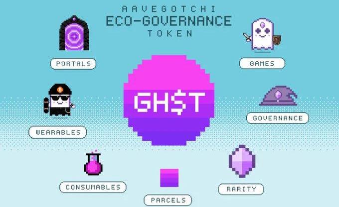 GHSTAavegotchis是以太坊鏈上的加密收藏品平臺,與其它流行的區塊鏈游戲一樣使用ERC721標準協議。Aavegotchis擁有三種屬性,這些屬性決定了它們在Aavegotchi宇宙中的整體價值和稀有度--抵押物、特征和可穿戴設備。Aavegotchi基于DeFi借貸平臺Aave生態,并為以太坊區塊鏈游戲引入了多項創新,包括DeFi代幣抵押、動態變化的稀有性、稀缺性收益挖礦,基于DAO治理的游戲機制以及微型游戲的虛擬空間等。Aavegotchi聯合創始人兼技術架構師DanMathieu表示:Aavegotchi正在努力把各個區域中的創新融合起來,如增值的NFT、加密藝術領域的鏈式存儲,以及DeFi的流動性挖礦等,以提供比其各個部分相加總和還大的游戲體驗價值。