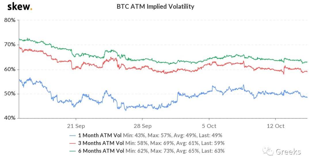 BTC歷史波動率10d28%30d35%90d49%1Y80%期權持倉量16億美元,期權成交量1.06億美元。各標準化期限隱含波動率:今日:1m49%,3m59%,6m63%10/14:1m50%,3m60%,6m64%