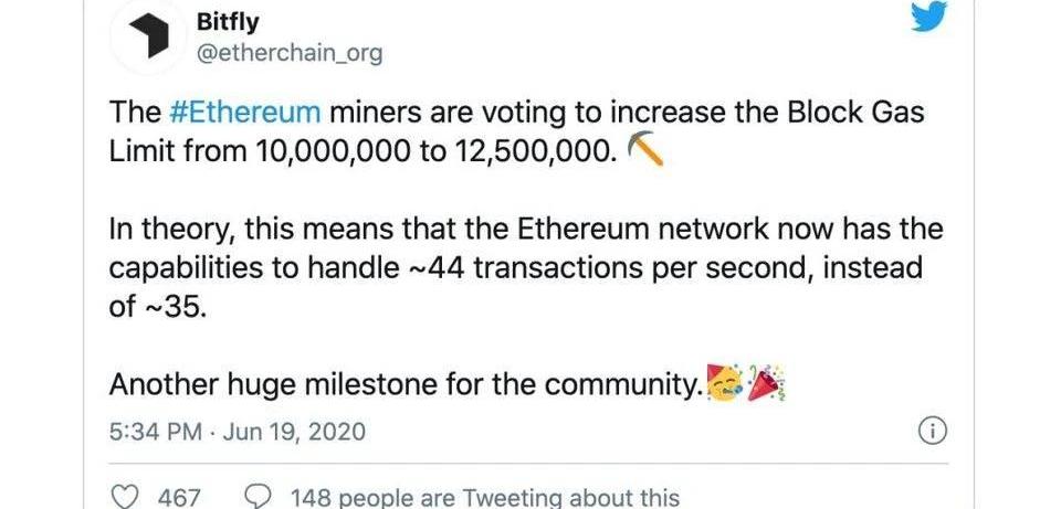 星火、Ethermine和魚池三家獲得主要區塊。除了進行硬分叉外,礦池運營者有重要治理責任:他們可以設置以太坊gas上限。與出塊時間和gas價格不同,gas上限由每個區塊各自確定。新gas上限限于上一區塊的0.1%,所以每個區塊僅能做出微小浮動。要是三家礦池一致同意快速復利滾動單邊浮動,兩個半小時gas上限就能翻倍或減半。要是意見不一致,gas上限就是礦池規模的加權平均數。目前由于缺少礦工實際操作的詳細信息,我們會用簡單的方法:投票系統。希望未來我們可以軟分叉,變為更精確的算法。**以太坊設計原理**以太坊早期礦工設定gas上限的方式是「補缺解決方案」。很多「補缺解決方案」足夠好,就變成了備用參數。EIP1559建議采用不同機制,目前正在討論在柏林分叉時應用。這之前,礦池運營者可像OPEC控制石油產量一樣控制gas供應量。