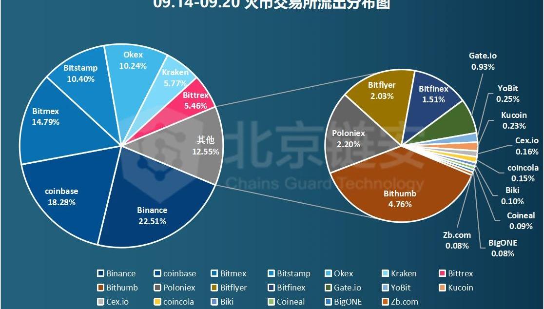 從數據來看,火幣交易所過去一周在關聯的鏈上交易方面活躍度整體下降,繼續維持凈流出狀態,但是凈流出幅度也有所減少。三大交易所流出分布:在過去一周,交易所之間的比特幣來往又呈現怎樣的分布呢?我們將幣安、火幣、OKEx三大交易所流出到各交易所的比例在這里向各位呈現。